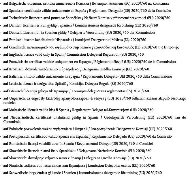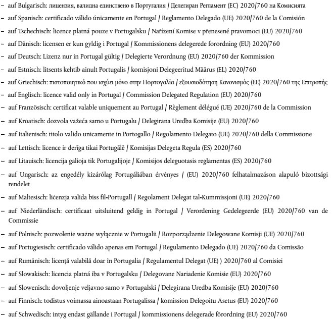 | Besondere Vermerke auf dem Lizenzantrag und auf der Lizenz | Die Lizenzen enthalten in Feld 24 die Angabe 'Nicht verwendbar für Erzeugnisse mit Ursprung im Vereinigten Königreich'. |