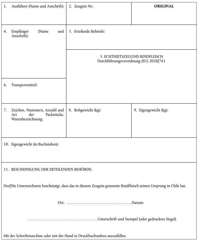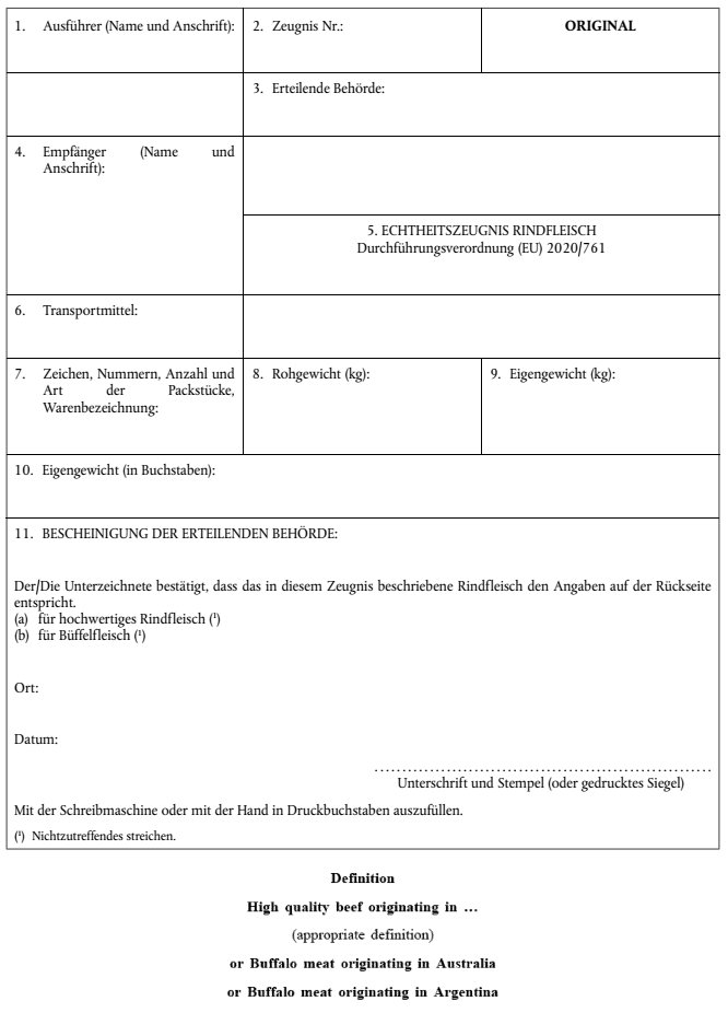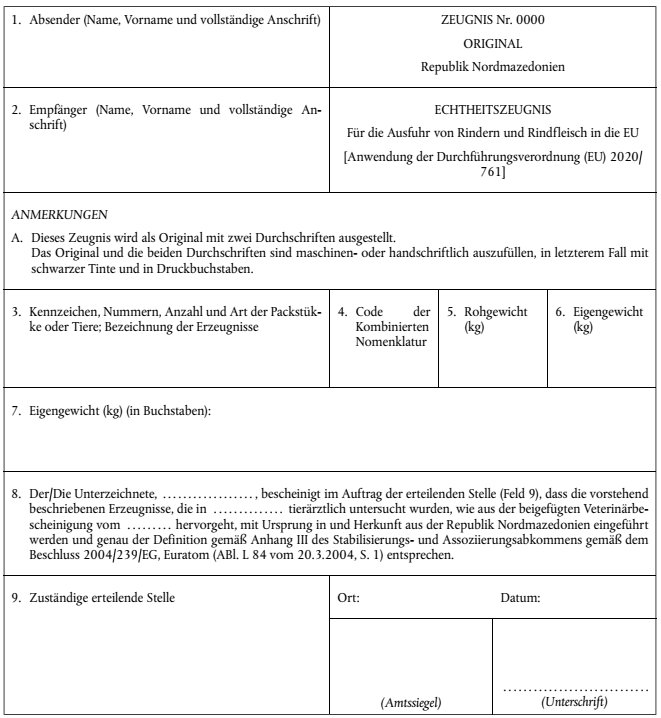 | Besondere Vermerke auf dem Lizenzantrag und auf der Lizenz | In Feld 8 des Einfuhrlizenzantrags und der Einfuhrlizenz ist das Ursprungsland anzugeben; in diesem Feld ist "Ja" anzukreuzen. |