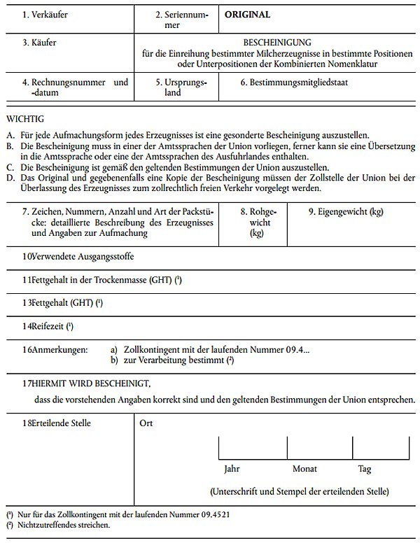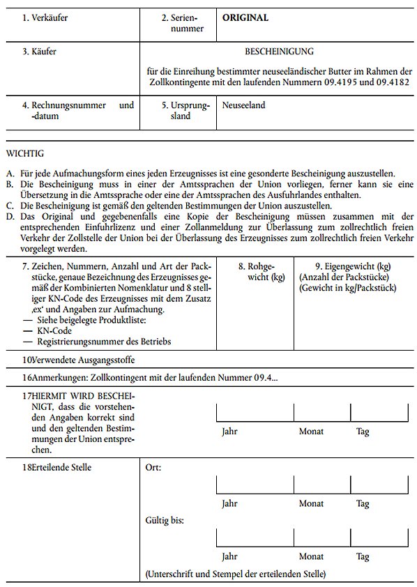 | Besondere Vermerke auf der Lizenz | In Feld 8 des Einfuhrlizenzantrags und der Einfuhrlizenz ist das Ursprungsland anzugeben; in diesem Feld ist "Ja" anzukreuzen. |