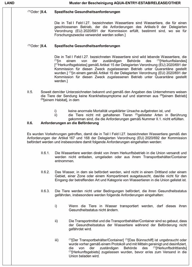 | Muster der Veterinärbescheinigung für den Eingang in die Union von Wassertieren, die für bestimmte Aquakulturbetriebe, zur Freisetzung in offenen Gewässern oder für andere Zwecke außer dem unmittelbaren menschlichen verzehr bestimmt sind (MUSTER "AQUA- ENTRYESTAB/RELEASE/OTHER") | Anhang II |