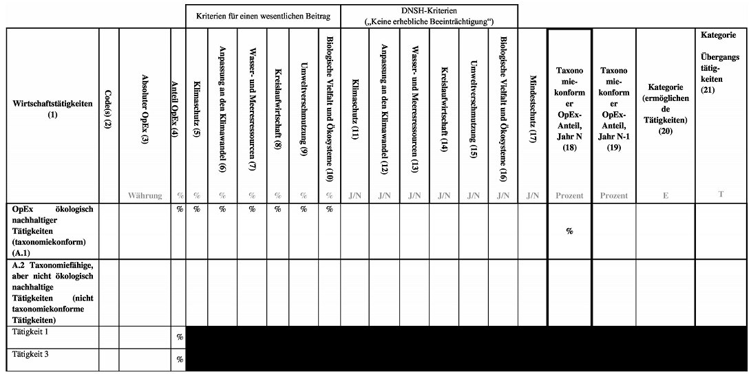 | 7. | Betrag und Anteil anderer, in den Zeilen 1 bis 6 nicht aufgeführter nicht taxonomiefähiger Wirtschaftstätigkeiten im Nenner des anwendbaren KPI | ||