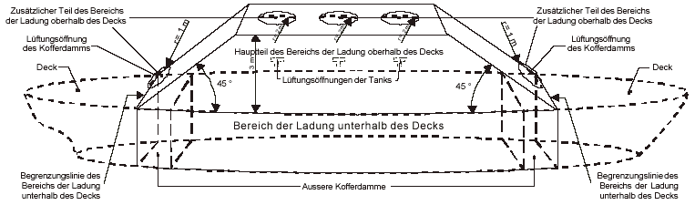 Der Raum, der gebildet wird durch die im Hauptteil des Bereichs des Ladung oberhalb des Decks nicht eingeschlossenen Kugelsegmente mit einem Radius von 1 m um die Lüftungsöffnungen des Kofferdamms und die unter Deck im Bereich der Ladung angeordneten Betriebsräume und mit einem Radius von 2 m um die Lüftungsöffnungen der Ladetanks und um Öffnungen der Pumpenräume;