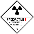 | (Nr. 7A) Kategorie I - WEISS Strahlensymbol: schwarz auf weißem Grund; (vorgeschriebener) Text: schwarz in der unteren Hälfte des Gefahrzettels: "RADIOACTIVE" "CONTENTS ..." "ACTIVITY ... "; dem Ausdruck "RADIOACTIVE" folgt ein senkrechter roter Streifen; Ziffer "7" in der unteren Ecke |
