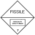 | (Nr. 7E) Spaltbare Stoffe der Klasse 7 weißer Grund; (vorgeschriebener) Text: schwarz in der oberen Hälfte des Gefahrzettels: "FISSILE"; in einem schwarz eingerahmten Feld in der unteren Hälfte des Gefahrzettels: "CRITICALY SAFETY INDEX"; Ziffer "7" in der unteren Ecke |
