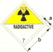 (Strahlensymbol, darunter die Aufschrift "RADIOACTIVE" und Ziffer 7; Symbol und Aufschrift schwarz; Grund: obere Hälfte gelb; untere Hälfte weiß. Die Verwendung des Wortes "RADIOACTIVE" in der unteren Hälfte ist freigestellt, um alternativ die dieser Sendung entsprechende Kennzeichnungsnummer des Stoffes anzugeben): a = 5 mm; b = Versandstück 100 mm, Großcontainer/ Tanks/ Fahrzeuge 250 mm mindestens |
