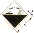 (wie Zettel 7B, aber mit drei senkrechten Streifen in der unteren Hälfte): a = 5 mm; b = Versandstück 100 mm, Großcontainer/ Tanks/ Fahrzeuge 250 mm mindestens |