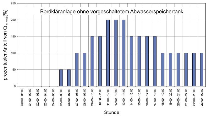 Abbildung 2: Tagesganglinie der Bordkläranlagen-Beschickung ohne vorgeschalteten Abwasserspeichertank