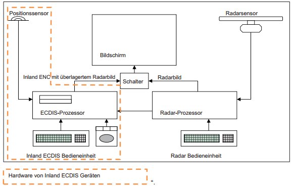 Ausgenommen von Satz 1 sind Bildschirmgeräte, die im Navigationsmodus in der Systemkonfiguration 3 betrieben werden, sowie Hardwarekomponenten, die der Bereitstellung der Radarinformationen vom Radar-Prozessor für die Darstellung auf dem Bildschirm des Inland-ECDIS-Gerätes dienen.