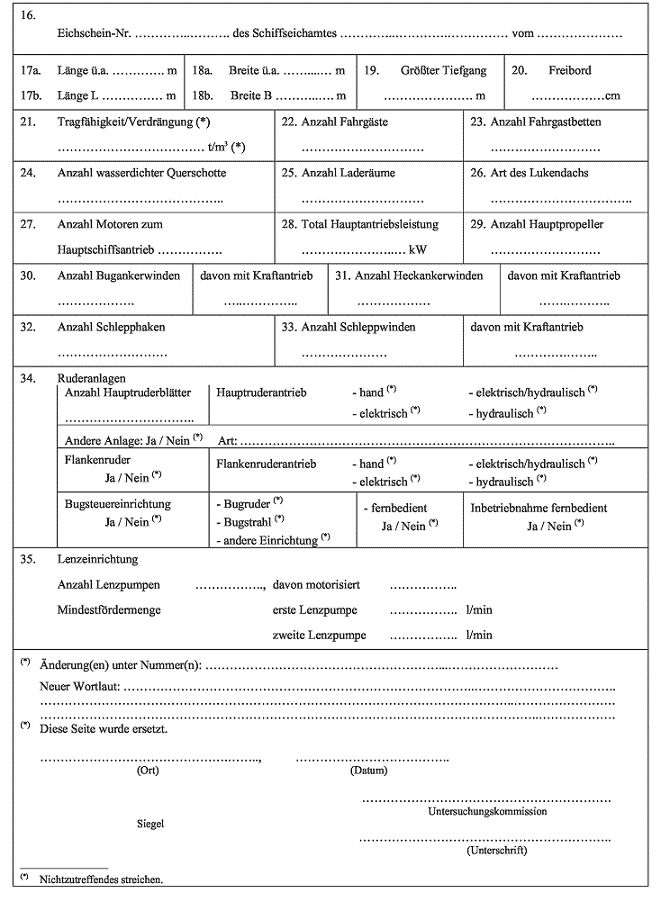 eigener Untersuchung vom * ............................... der Bescheinigung vom * ................................ der anerkannten Klassifikationsgesellschaft * ...................................................................... zur Fahrt im sonstigen Schiffsverkehr (z.B. Wechsel der Fährstelle, Fahrt zu oder von einer Werft) - auf den Wasserstraßen der Zone(n) * in (Name des Staates) * ......................................................................................................... mit Ausnahme von: ................................................................................................................ - auf den folgenden Wasserstraßen in (Name des Staates) * ................................................. mit der angegebenen Ausrüstung und Besatzung für tauglich befunden worden. Bemerkungen (Bedingungen und Auflagen): |