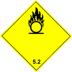 Versandstücke mit organischen Peroxiden der typen B, C, D, E oder F müssen mit dem Kennzeichen der Klasse 5.2 (Muster Nr. 5.2) versehen werden. Dieses Kennzeichen impliziert auch, dass das Produkt entzündbar sein kann, so dass kein Zusatzkennzeichen "FLAMMABLE LIQUID" (Muster Nr. 3) erforderlich ist. Die folgenden Zusatzkennzeichen müssen jedoch angebracht werden: