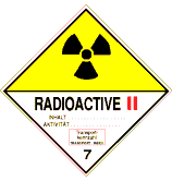 Strahlensymbol: schwarz auf gelbem Grund mit weißem Rand (obere Hälfte), untere Hälfte: weiß. Text: (vorgeschrieben): schwarz in der unteren Hälfte des Kennzeichens RADIOACTIVE "Contens ...." "Activity ....." in einem eingerahmten Feld: "Transport Index" |