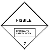 | ( Nr. 7E) Spaltbare Stoffe der Klasse 7 weißer Grund Text (vorgeschrieben): schwarz in der oberen Hälfte des Kennzeichens "FISSILE" In einem schwarzen eingerahmten Feld in der unteren Hälfte des Kennzeichens: "CRITICALITY SAFETY INDEX" Ziffer 7 in der unteren Ecke |