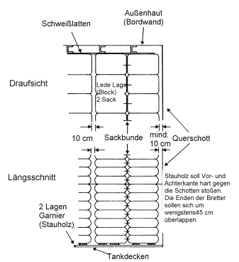 die Güter müssen auf Holzgrätingen, Holzpaletten, oder Stauholz unmittelbar auf dem Deck und nicht auf anderer Ladung gestaut werden; eine Holzverschalung der Bordwände, Schotten und Raumstützen ist nicht erforderlich,