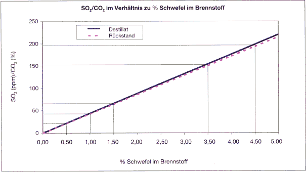 2 Die Übereinstimmung zwischen dem SO2/CO2-Verhältnis kann durch einfache Kontrolle der entsprechenden Kohlenstoffanteile je Masseeinheit der Destillate und Rückstandsöle nachgewiesen werden. Für diese Gruppe von Kohlenwasserstoff-Brennstoffen bleibt der Kohlenstoffgehalt als der Vomhundertsatz der Masse ausgedrückte Anteil fast gleich, während der Wasserstoffanteil abweicht. Daraus lässt sich schließen, dass für einen bestimmten Kohlenstoffverbrauch durch die Verbrennung der Verbrauch von Schwefel im Verhältnis zum Schwefelgehalt des Brennstoffs steht, das heißt in anderen Worten ein konstantes Verhältnis zwischen Kohlenstoff und Schwefel, das an das Molekulargewicht von Sauerstoff aus der Verbrennung angepasst ist.