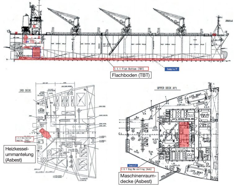4.2.8.2 Jede Unsicherheit hinsichtlich des Vorhandenseins gefährlicher Materialien soll mithilfe einer Sichtkontrolle/Stichprobenkontrolle abgeklärt werden. Die Kontrollpunkte sollen im Schiffsplan vermerkt werden und können durch Fotos ergänzt werden.