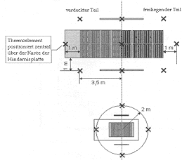 *) Die drei Positionen an beiden Enden der Lastkraftwagen-Brennstoffpackung werden für die Akzeptanz-Bewertung eingesetzt, die drei Positionen im und um das Entzündungs-Zentrum werden für Sicherheitszwecke eingesetzt, um während der Prüfung bestimmen zu können, ob die Decke in Gefahr ist. Bei der Personenkraftwagen-Brennstoffpackung werden alle vier Positionen für die Akzeptanz-Bewertung eingesetzt.