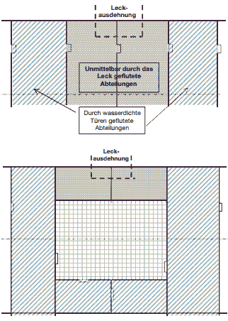 2.3 Die Schwimmfähigkeitsbeurteilung muss die ungünstigsten Fälle berücksichtigen, in denen zusätzlich Abteilungen gefl utet werden, die durch wasserdichte Türen verbunden sind, deren Offenbleiben während der Fahrt beantragt wurde. In den Berechnungen der Schwimmfähigkeitsbeurteilung muss das Flutungsausmaß wie folgt angesetzt werden: jede wasserdichte Tür, deren Offenbleiben während der Fahrt beantragt wurde, darf in jedem Flutungsfall als geschlossen angenommen werden, falls sie sich in einem wasserdichten Schott befi ndet, das durch mindestens ein unbeschädigtes wasserdichtes Querschott/ eine unbeschädigte Tür von der Schadensausdehnung getrennt liegt.