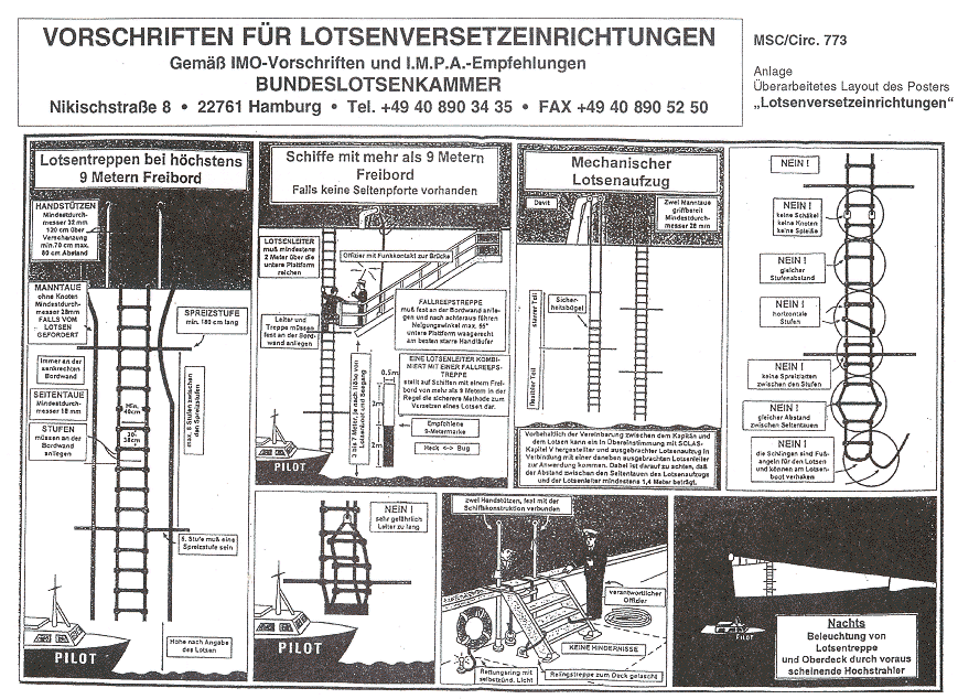 1 Der Schiffssicherheitsausschluß hatte auf seiner vierundsechzigsten Tagung (5. bis 9. Dezember 1994) ein Poster mit genauen Vorschriften für Lotsenversetzeinrichtungen angenommen. Eine Kopie hiervon wurde mit dem MSC-Rundschreiben 568/Rev.1 vom 23. Februar 1995 verbreitet.