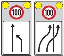 (12) Bei beweglichen Arbeitsstellen wird die Vorwarntafel (Bild A-4 [links]) in der Regel auf dem Standstreifen mitgeführt. Auf Fahrbahnen ohne befestigten Seitenstreifen sollten die Vorwarneinrichtungen ebenfalls neben der Fahrbahn aufgestellt werden.