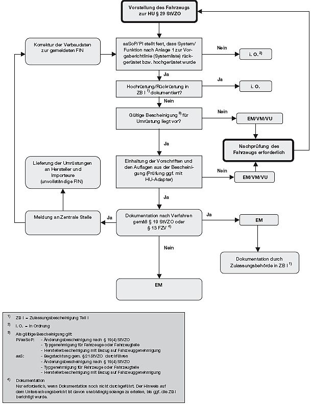 Wird bei der Durchführung der HU an einem Fahrzeug vom aaSoP/PI festgestellt, dass Bauteile oder Systeme im Fahrzeug verbaut sind, für die noch keine Vorgaben entsprechend Nr. 1 und Nr. 4 Anlage VIIIa StVZO vorliegen und insoweit die Beurteilung der Verkehrssicherheit, Umweltverträglichkeit sowie Vorschriftsmäßigkeit nicht möglich ist, so muss der aaSoP/PI eine geeignete Untersuchung durchführen. Dabei sind die erforderlichen Verbauinformationen von ihm zu dokumentieren und über den Leiter der Technischen Prüfstelle (TP) oder Technischen Leiter der Überwachungsorganisation (ÜO) an die Zentrale Stelle zu übermitteln.