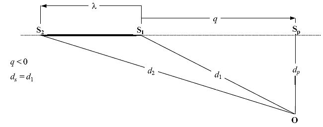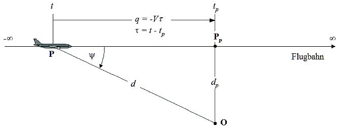 Es ist zu beachten, dass die Flugzeitτ in Bezug auf den Punkt des kleinsten Vorbeiflugabstands negativ ist, wenn sich das Luftfahrzeug vor dem Immissionsort befindet und in diesem Fall die relative Entfernungq bis zum Punkt des kleinsten Vorbeiflugabstands positiv wird. Hat das Luftfahrzeug den Immissionsort passiert, wirdq negativ.