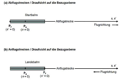Der Luftfahrzeugbezugspunkt PF bildet den Ursprung des Streckenkoordinatensystemss", auf das sich die Fixpunktprofile beziehen. PF ist bei Abflügen der Startpunkt, bei Anflügen die Landeschwelle und bei Hubschraubern die Hubschrauberstart- und -landestelle.