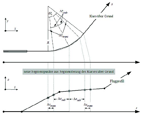 19) Es werden Untersegmente eingefügt, um Kontursprünge an den Verbindungsstellen zwischen Geradeaus- und Kurvenflug infolge abrupter Änderungen des Querneigungswinkels zu vermeiden und lineare Querneigungswinkelübergänge über die ersten und letzten 5 Grad der Flugkurve zu ermöglichen. In den Flugleistungsrechnungen ist das nicht notwendig; der Querneigungswinkel ist immer durch Gleichung ( B.8) gegeben.