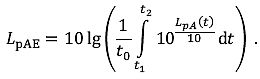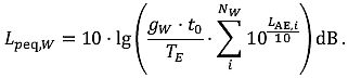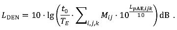 Bezeichnet den zehnfachen dekadischen Logarithmus des Produkts von der logarithmischen Summe der vonNW Schallereignissen ausgehenden Schallexpositionspegel, die am jeweiligen Immissionsort während der ErhebungszeitTE im ZeitintervalltW auftreten und dem Quotienten(gW· to) / TE der ZeitgewichtungsfaktorengW , to undTE (z.B.LDay,LDEN).
