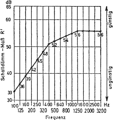 Das Luftschallschutzmaß - LSM - wird ermittelt, indem die Sollkurve nach der Abbildung lotrecht und parallel um ganze dB verschoben wird, bis die mittlere Abweichung zwischen den Meßpunkten und der verschobenen Sollkurve< 2 dB ist. Die hierfür - bei positivem Schallschutz - größtmögliche oder - bei negativem Schallschutz - mindest notwendige Verschiebung ist das Luftschallschutzmaß.