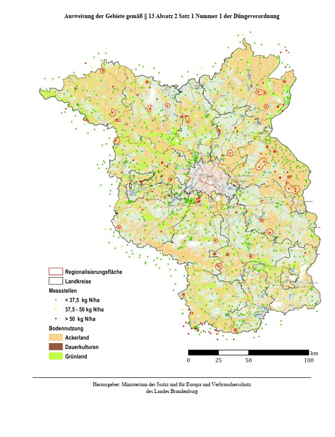 (1) Das für Landwirtschaft zuständige Mitglied der Landesregierung legt fest, welche Gebiete von § 13 Absatz 2 Satz 1 Nummer 1 der Düngeverordnung erfasst werden. Die Gebiete sind in der Übersichtskarte der Anlage farblich dargestellt und über den Geobroker der Landesvermessung und Geobasisinformation Brandenburg https://geobroker.geobasis-bb.de in digitaler Form beziehbar. Nachfolgende Änderungen der betroffenen Gebiete werden ausschließlich im Digitalen Feldblockkataster des Landes Brandenburg bekannt gemacht.