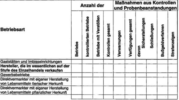 Die VLÜÄ erstellen jährlich für den Zeitraum des Vorjahres einen Bericht über die amtliche Lebensmittelüberwachung, der eine der Grundlagen für den Bericht nach § 22 AVV RÜb bildet. Der Bericht besteht aus einem statistischen Teil nach dem Muster der Anlagen 1a und 2 sowie einem erläuternden Textteil, in dem wesentliche Ergebnisse der Überwachungsarbeit und besondere Vorkommnisse darzustellen sind. Dazu gehören insbesondere Informationen zu Verkehrsverboten, Sicherstellungen, Betriebsschließungen oder sonstigen besonderen Vorkommnissen, z.B. lebensmittelbedingte Krankheitsausbrüche. Beispiele für Bußgelder und Strafanzeigen sind in den Textbericht aufzunehmen. Die Angaben zur Fortbildung des Überwachungspersonals sind in tabellarischer Form beizufügen.
