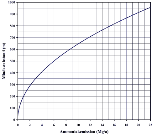 Bei Anlagen zum Halten oder zur Aufzucht von Nutztieren wird mit Hilfe der Emissionsfaktoren der Tabelle 11 für Tierart, Nutzungsrichtung, Aufstallung und Wirtschaftsdüngerlagerung und für die jeweiligen Tierplatzzahlen die unter ungünstigen Bedingungen zu erwartende Ammoniakemission der Anlage je Jahr ermittelt. Bei unterschiedlichen Tierarten, Haltungsarten und Nutzungsarten sind die jeweiligen jährlichen Ammoniakemissionen zu addieren. Mit dieser jährlichen Ammoniakemission kann aus der Abbildung 4 der Mindestabstand entnommen werden, dessen Unterschreiten einen Anhaltspunkt für das Vorliegen erheblicher Nachteile gibt.