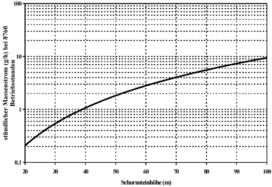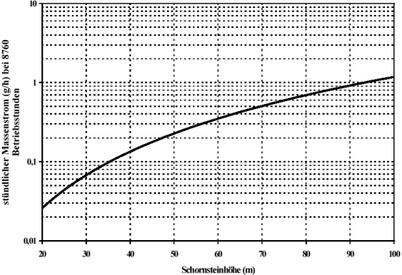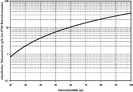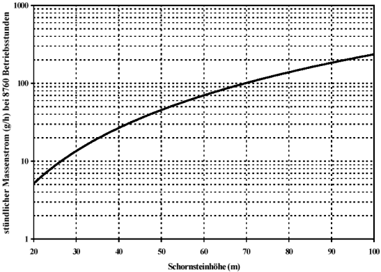 Die Mindestabstandskurve ist für bodennahe Quellen abgeleitet und berücksichtigt eine mögliche Verminderung der Immissionskonzentration durch Ableitung der Abgase über Schornsteine entsprechend Nummer 5.5 nicht. Gegebenenfalls ist zur Berücksichtigung dieser Ableitungsbedingungen eine Ausbreitungsrechnung nach Anhang 3 durchzuführen.
