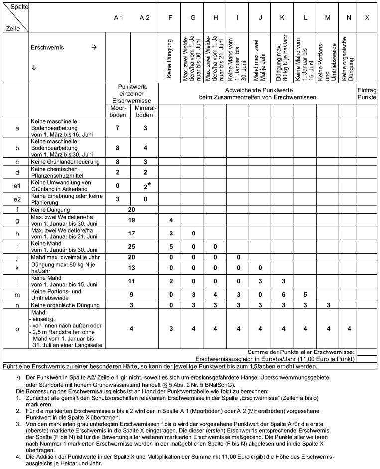 (1) Der Erschwernisausgleich wird für eine bestimmte Fläche gewährt. Seine Höhe ist nach der Anlage (Punktwerttabelle) zu berechnen. Ergibt die Berechnung für die Flächen, für die Erschwernisausgleich beantragt ist, einen Betrag von weniger als 150 Euro, so wird der Erschwernisausgleich nicht gewährt (Bagatellgrenze).