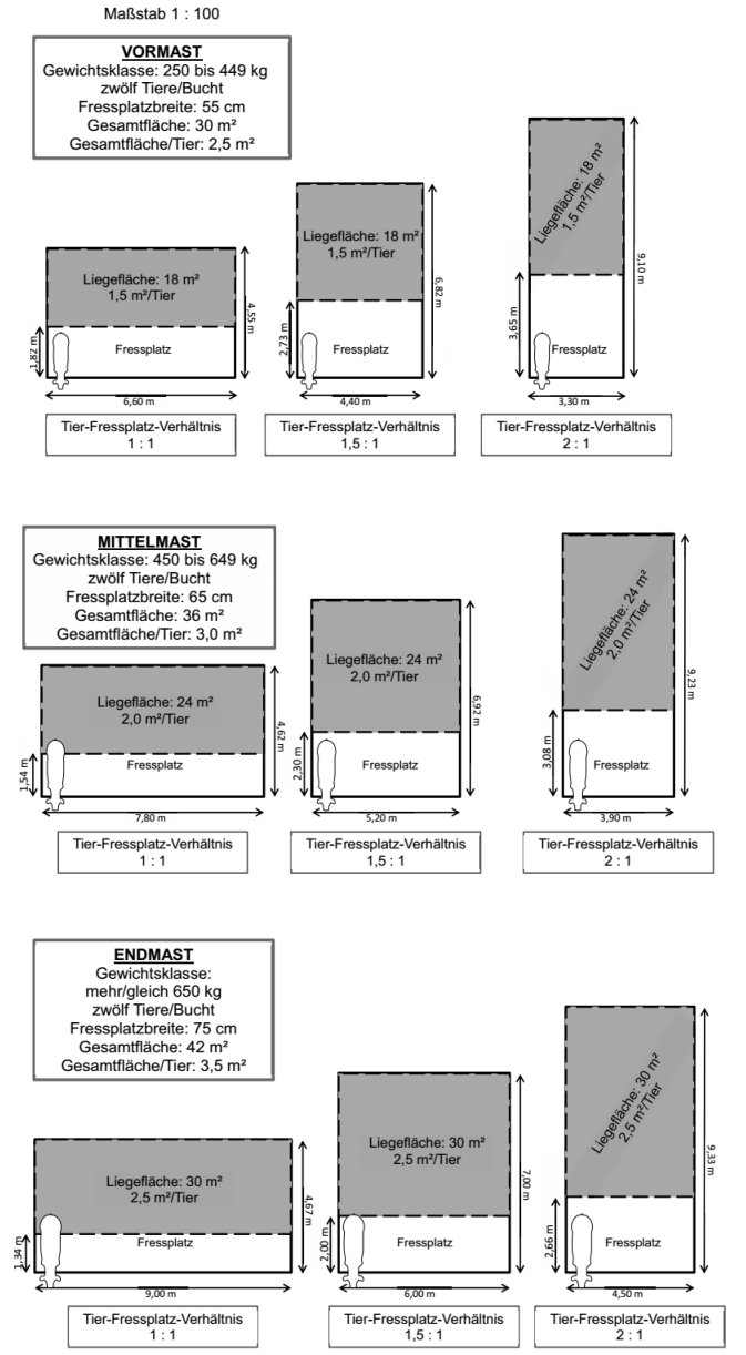 Die Beispiele basieren auf einer Gruppengröße von zwölf Tieren. Bei dieser Gruppengröße sind alle dargestellten Varianten denkbar und praktikabel umsetzbar. Werden die Gruppen größer, so ist eher auf eine Tiefbucht und damit auf ein weites Tier-Fressplatz-Verhältnis zu setzen. Werden die Gruppengrößen deutlich kleiner (z.B. weniger als fünf Tiere) so ist ein engeres Tier-Fressplatz-Verhältnis von ca. 1 : 1 zu bevorzugen. Je nach Zuschnitt der Gebäude kann die optimale Lösung für den Betrieb auch zwischen den dargestellten Lösun- gen liegen.