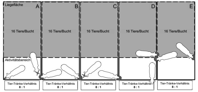 Bei der empfohlenen Durchflussleistung ist es tierschutzfachlich vertretbar, dass eine Einzelschalentränke, die in der Buchtentrennwand angebracht ist, als vollwertige Tränkestelle angesehen wird. Ist die Durchflussleistung einer Schalentränke jedoch deutlich geringer, erhöht sich die Zeit der Tränkenutzung um ein Vielfaches und kann z.B. Grund für Unruhe und/oder Rangordnungskämpfe sein. Beispielsweise stellen Doppeltränken in der Buchtentrennwand (Beispiele D und E) eine empfehlenswerte Alternative dar und ermöglichen das zeit- gleiche Trinken von zwei Tieren aus benachbarten Buchten an derselben Tränkestelle.