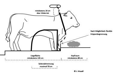 | Haltungseinrichtungen müssen nach Bauweise, Material, technischer Ausstattung und Zustand so beschaffen sein, dass von ihnen - entsprechend dem Stand der Technik - keine vermeidbaren Gefahren für die Gesundheit ausgehen und den Tieren eine Deckung ihres Bedarfs möglich ist. Rinder dürfen nicht mehr als unvermeidbar mit Harn und Kot in Berührung kommen. |
