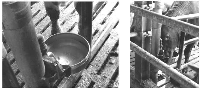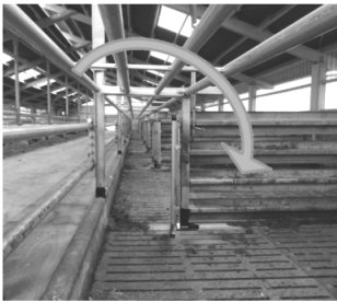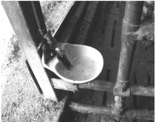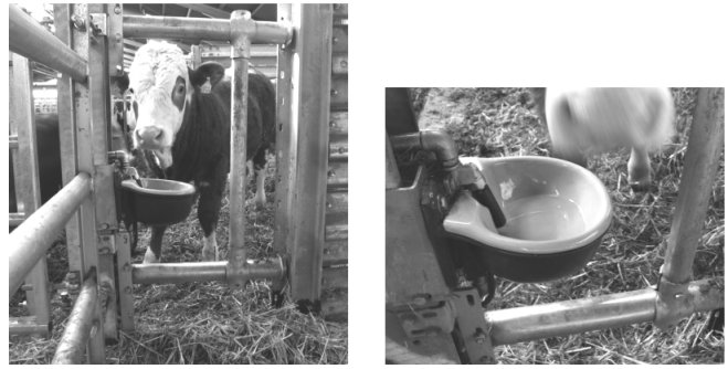 In Zweiflächenställen mit Schwenkgittern zwischen den Buchten können die Tränken am Übergang der Aktivitätsfläche zur Liegefläche angebracht werden. Eine gefahrlose Reinigung der Tränke ist durch Abgattern der Tiere möglich.