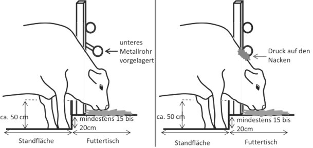 Die Haltungsbedingungen müssen so beschaffen sein, dass jedem Tier Zugang zu einer ausreichenden Menge Futter gewährt wird. Dieses kann dadurch gewährleistet werden, dass jedem Tier ein Fressplatz zur Verfügung steht (bei rationierter Fütterung muss ein Tier-Fressplatz-Verhältnis von 1 : 1 eingehalten werden). Davon abweichend ist auch ein weiteres Tier-Fressplatz-Verhältnis möglich. Voraussetzung hierfür ist der Einsatz einer Futtermischung oder entsprechender Technik, sodass eine gleichmäßige, ausgewogene Versorgung der Tiere sichergestellt ist. Nachschieben bzw. erneute Futtervorlage müssen dabei so regelmäßig erfolgen, dass Grundfutter ständig vorliegt. Unter diesen Bedingungen kann das Tier-Fressplatz-Verhältnis auf bis zu 2 : 1 erweitert werden. Dies gilt insbesondere für Buchten ab einer Tiefe von 5,00 m, die eine Strukturierung in Fress- und Liegebereich aufweisen. Darüber hinaus sind ggf. Einzelfallentscheidungen zu treffen.