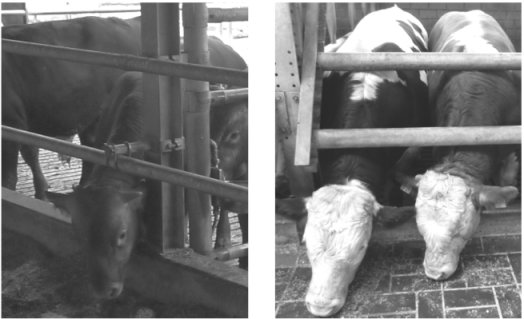 Rinder grasen in langsamer Vorwärtsbewegung. Durch das Vorstellen einer Vordergliedmaße gelangen sie mit dem Flotzmaul etwa 15 cm tiefer in Richtung Bodenoberfläche als bei geschlossen stehenden Vorderbeinen. Kann diese Schrittstellung von den Tieren bei Stallhaltung bautechnisch bedingt nicht eingenommen werden, muss Futter erhöht angeboten werden.