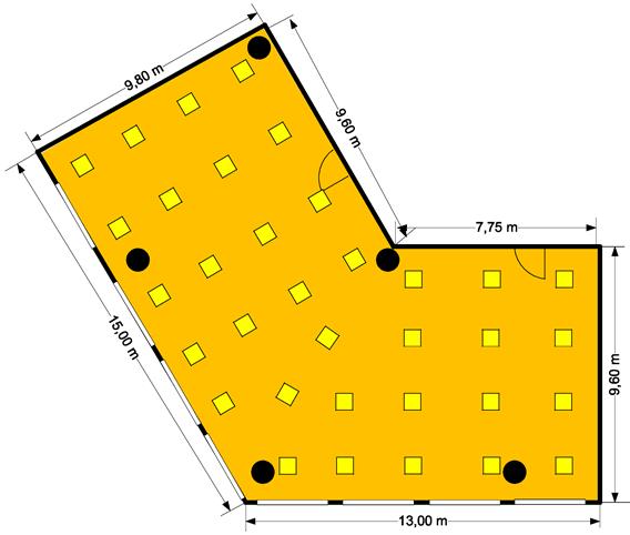 4) In der DIN 12464-1 ist festgehalten, dass in der Nähe zu Wänden die Breite des Randstreifens mit 15% der kleinsten Abmessung des betrachteten Bereiches (hier: des Raumes) oder 0,5 m festgelegt wird, je nachdem, welcher der beiden Werte kleiner ist.