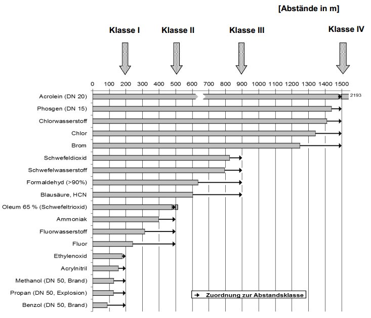 In Bild 1 im Anhang 1 sind die Abstandsempfehlungen für die Bauleitplanung ohne Detailkenntnisse dargestellt. Sie basieren auf einem deterministischen Ansatz, der im Einklang mit dem in Deutschland praktizierten Störfallrecht steht, und einer typisierenden Betrachtung. Die Grundlagen für die Berechnungen der Abstandsangaben sind in den Anhängen 1 und 3 aufgeführt. Anhang 2 enthält für die einzelnen in Bild 1 enthaltenen Stoffe die Ergebnisse der Abstandsberechnungen zu verschiedenen Leckflächen.