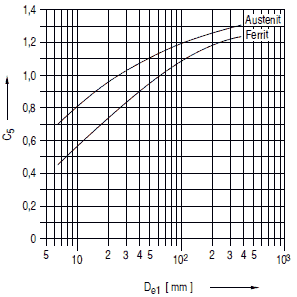 | Die Verwendung der Spannungsbeiwerte ist nur erlaubt, wenn die Forderungen der Dimensionierung gemäß Anhang a erfüllt sind. Außerdem sind die B-Werte nur anwendbar, falls da / sc ≤ 50, die C- und K-Werte, falls da / sc ≤ 100 ist. Für 50 < da / sc ≤ 100 bleiben die B1-Werte gültig, die B2-Werte sind mit dem Faktor 1 / (X · Y) zu multiplizieren, wobei X = 1,3 - 0,006 · (da / sc) und Y = 1,0224 - 0,000594 · T mit Y ≤ 1,0 für ferritische und Y = 1,0 für andere Werkstoffe. T : Auslegungstemperatur in °C 1) siehe Abschnitt 8.4.7.3.1 |