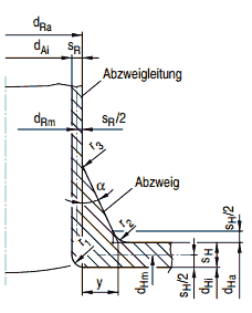 (1) Diese Berechnungsregeln gelten für aus dem Vollen geschmiedete, gebohrte und gedrehte Einschweiß-T-Stücke kleiner als oder gleich DN 100. Sie berücksichtigen nur die durch Innendruck hervorgerufenen Beanspruchungen. Zusätzliche Kräfte und Momente müssen gesondert berücksichtigt werden.