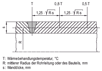 (2) Über den Glühbereich hinaus müssen bei Wanddicken über 30 mm in einem genügend breiten Wärmebereich Temperaturgradienten vermieden werden, die eine Bauteil- oder Werkstoffschädigung bewirken. Im Allgemeinen wird diese Forderung erfüllt, wenn bei geometrisch ungestörten Wandungen die Temperatur beidseitig der Naht in den Bereichen nach Bild 7-1 gesteuert wird.