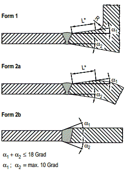 | 1) s1bei Schweißnähten an aufgesetzten Stutzen und Anschweißteilen (HV- und DHV-Nähte) 2) Die Bezugslänge beträgt 6 ⋅ s, bei Schweißnähten an aufgesetzten Stutzen und Anschweißteilen (HV- und DHV-Nähte) 6 ⋅ s1 |
