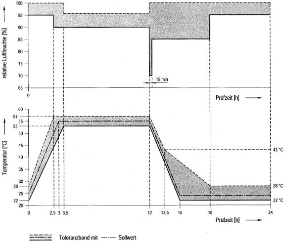 Bild 5 -1: Zeitlicher Verlauf der relativen Luftfeuchte und der Temperatur bei der Klimaprüfung nach Abschnitt 5.7.5