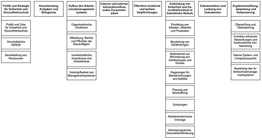 Die Organisation muss die Struktur des Arbeitsschutzmanagementsystems so aufbauen, dass es zur Umsetzung der Politik und Strategie für Sicherheit und Gesundheitsschutz und zum Erreichen der abgeleiteten Einzelziele geeignet ist. Die Struktur des Arbeitsschutzmanagementsystems muss bei intern oder extern ausgelösten Änderungen, beispielsweise solchen der Unternehmensstruktur oder der Unternehmensziele erforderlichenfalls angepasst werden.