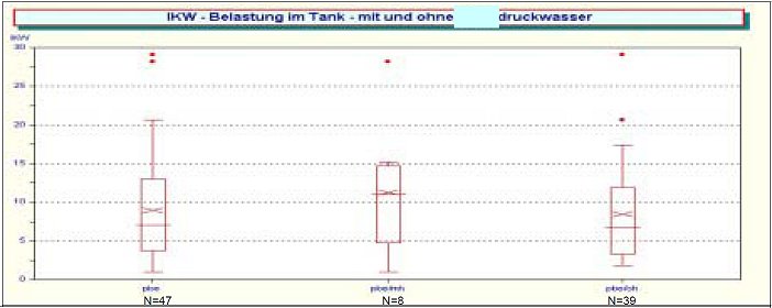 Durch Messungen in den Tanks nach beendeter Reinigung wurde festgestellt, dass beim Einstieg des Sachverständigen zur Innenprüfung des Tanks die Spitzenbegrenzung (max. 4x Grenzwert im 15-Minuten-Mittel) nicht eingehalten werden kann. Der Median für KW liegt bei dem Index 6,4 , das 95-Perzentil bei 27,6.