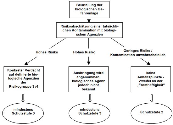 Eine Gefährdungsbeurteilung, wie sie die TRBa 400 für den bestimmungsgemäßen Betrieb von z.B. Laboratorien und Produktionsstätten bzw. Tätigkeiten in der Forst- und Agrarwirtschaft oder im Gesundheitswesen vorsieht, ist deshalb nicht möglich. In der Regel liegen zu Beginn des Ereignisses keine genauen Informationen über die biologischen Agenzien vor. Gleiches gilt für Art und Ausmaß der Ausbringung und die örtlichen Gegebenheiten. Aus diesem Grund ist zuerst davon auszugehen, dass es sich bei den ausgebrachten biologischen Agenzien um Erreger der Risikogruppen 3 oder 4 oder um Toxine handelt. Bei der Festsetzung der Schutzmaßnahmen ist deshalb zunächst vom höchsten möglichen Gefährdungspotenzial auszugehen, d. h. die Tätigkeiten sind der Schutzstufe 4 zuzuordnen. Die Schutzmaßnahmen sind entsprechend zu treffen. Hierbei sind alle bekannten Aufnahmewege zu berücksichtigen.